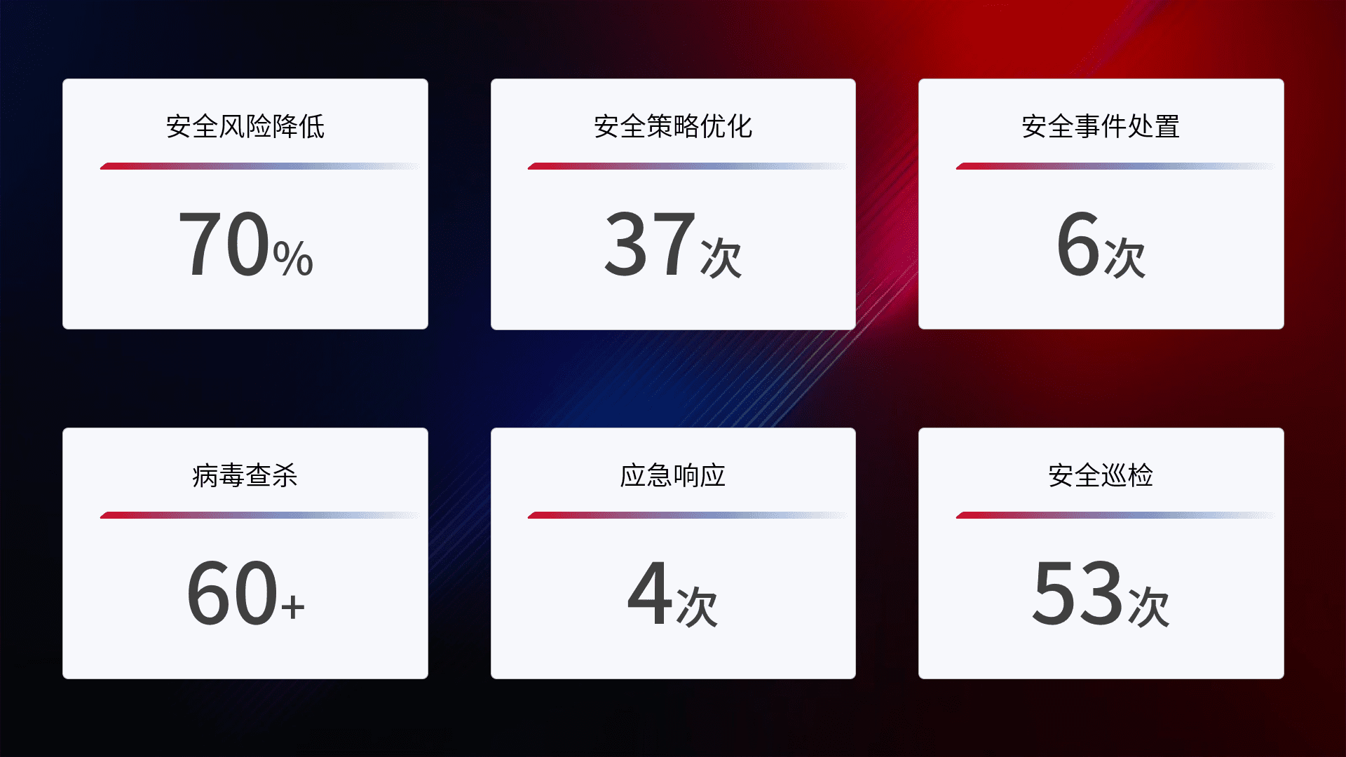 提供全面的安全事件报告体系,,包括处置报告、、、、周报、、、季度和年度总结,,结合持续监控,,,帮助客户深入了解网络安全状况。。。